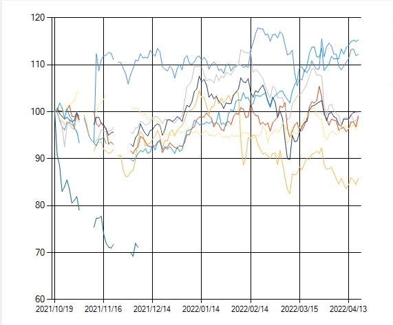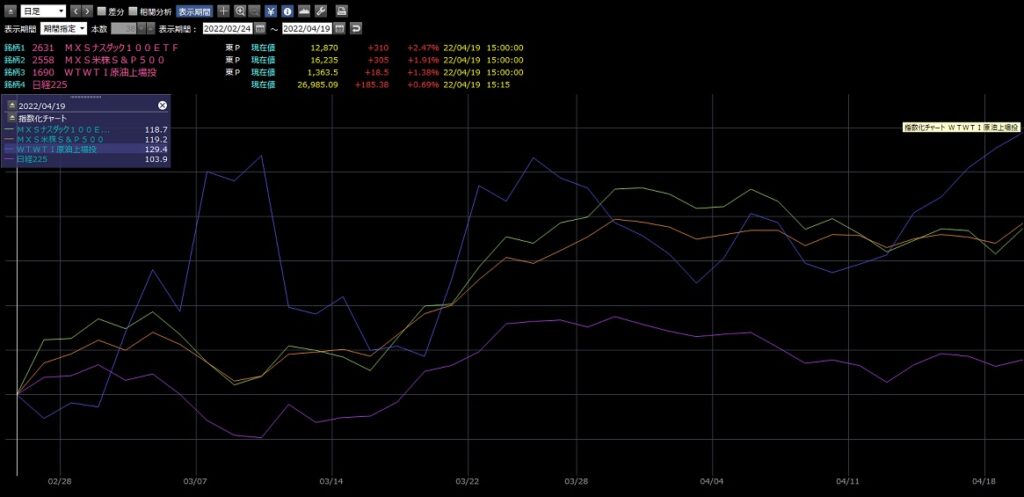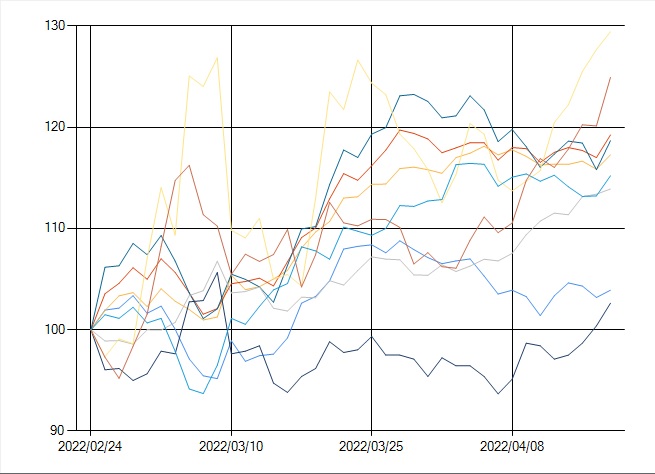 ウクライナ侵攻のあったとされる2022年2月24日~4月19日の指数化チャートを表示してみます。